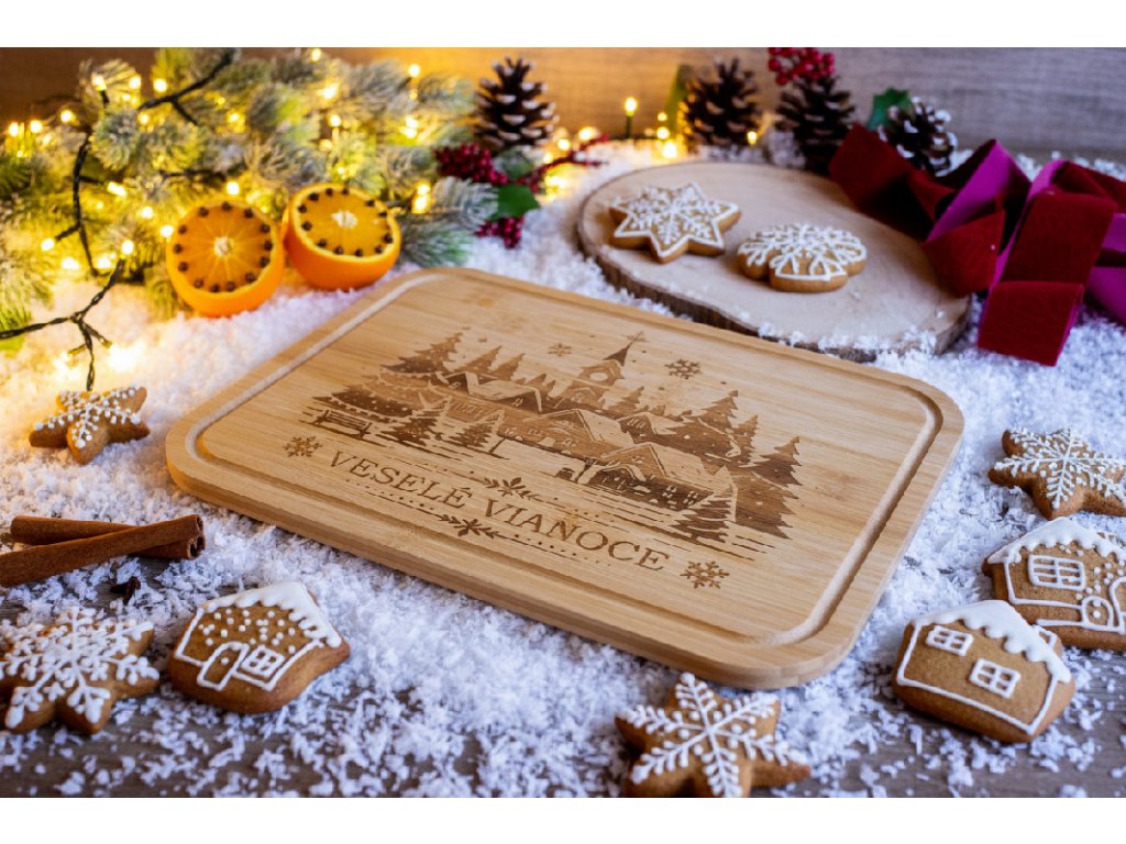 Kuchynská doska, ktorá sama o sebe vyzerá ako vianočná pohľadnica. Pevný bambus, na ňom detailne vygravírovaná zimná dedinka so snehovými vločkami a nápis VESELÉ VIANOCE – presne ten kúsok, ktorý z kuchyne spraví útulné miesto nielen na sviatočné varenie, ale aj na servírovanie dobrôt.