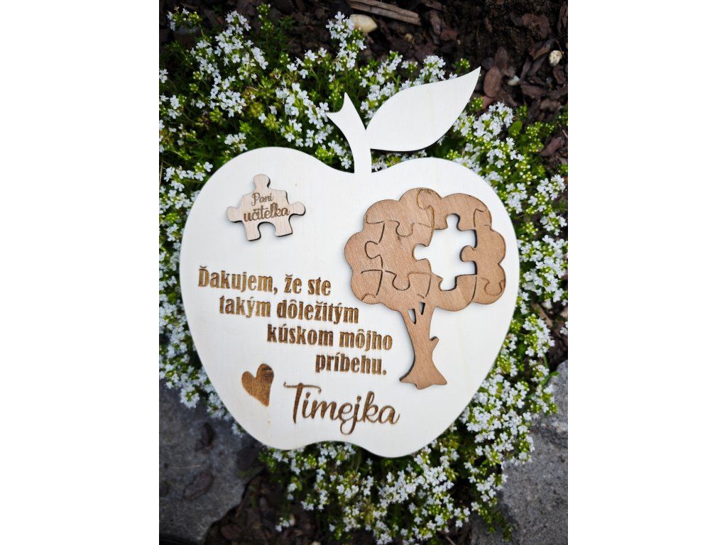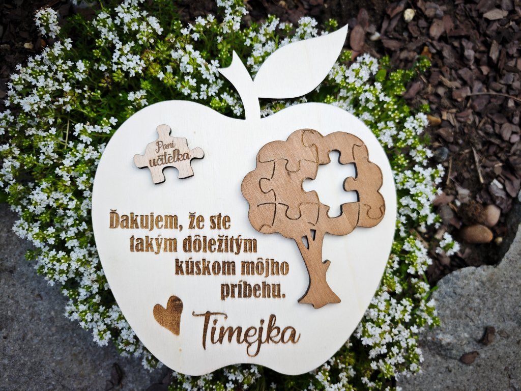 Drevené jablčko s textom „Pani učiteľka, ďakujem že ste tak dôležitým kúskom môjho príbehu“ symbolizuje práve túto myšlienku – že aj pani učiteľka je jedným z dielikov, ktorý pomáha formovať dieťa počas jeho školských rokov.