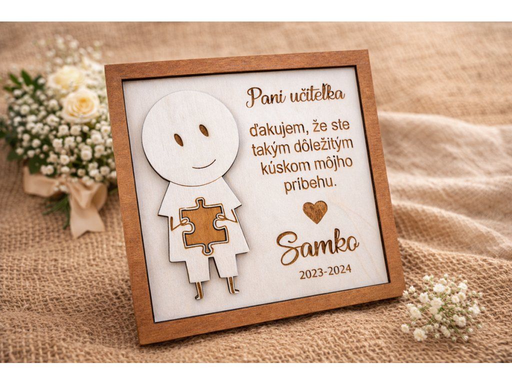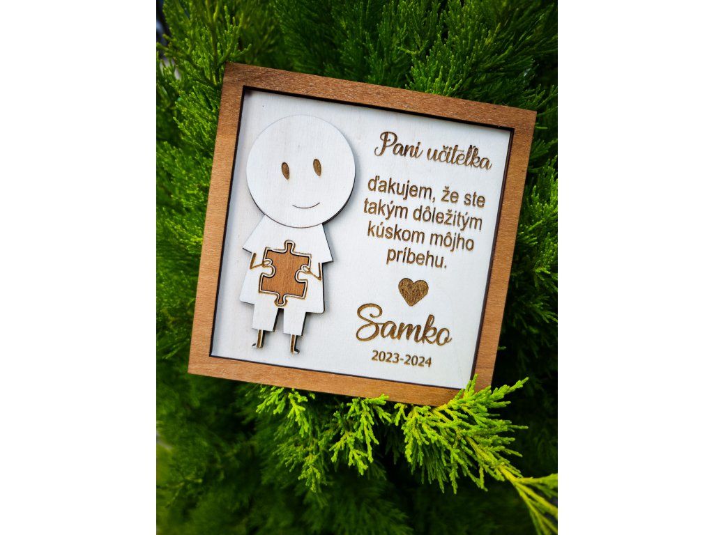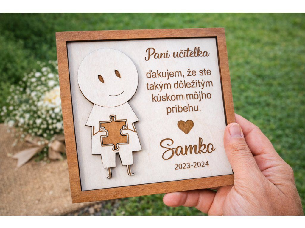 Drevené puzzle s textom „Pani učiteľka, ďakujem že ste tak dôležitým kúskom môjho príbehu“ symbolizuje práve túto myšlienku – že aj pani učiteľka je jedným dielikom, ktorý formuje dieťa počas jeho školského života.