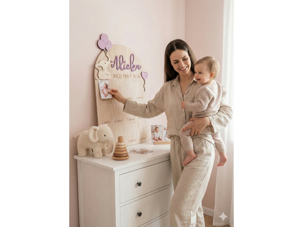 Zachyťte dvanásť najdôležitejších „prvýkrát“ na jednej elegantnej tabuli z prírodného bukového dreva. Každý mesiac doplníte jednu fotografiu a pred očami vám vznikne nežná kronika prvého roka – krásna spomienka aj efektná dekorácia na oslavu narodenín či do detskej izby, ktorá Vám zostane na celý život.