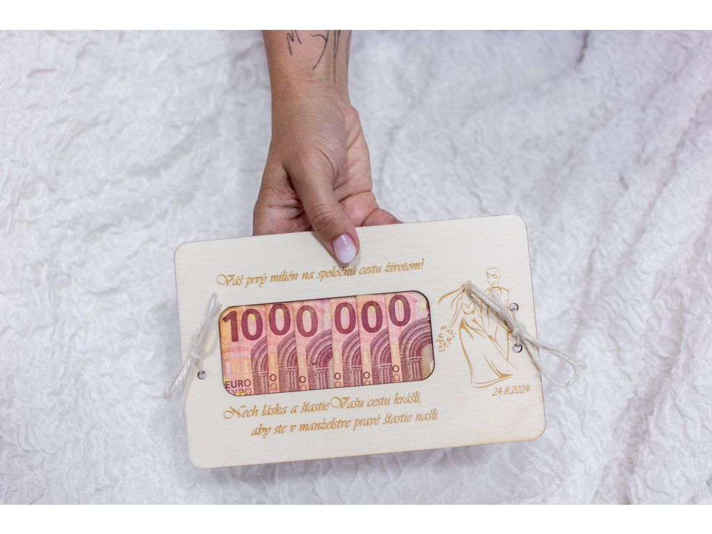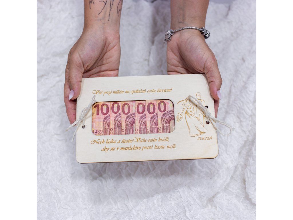 Originálna drevená obálka na peniaze „Môj prvý milión“ je výnimočný spôsob, ako darovať finančný dar novomanželom. Vďaka okienku na bankovky vytvára uložená hotovosť symbolický „milión“, ktorý sa stáva súčasťou dizajnu darčeka.