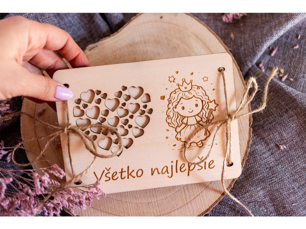Drevená obálka na peniaze s motívom malej princeznej je milým a originálnym spôsobom, ako darovať finančný dar dievčatku. Bankovky alebo darčekové poukážky sa vložia medzi dve drevené vrstvy a obálka sa zviaže prírodným jutovým povrázkom.