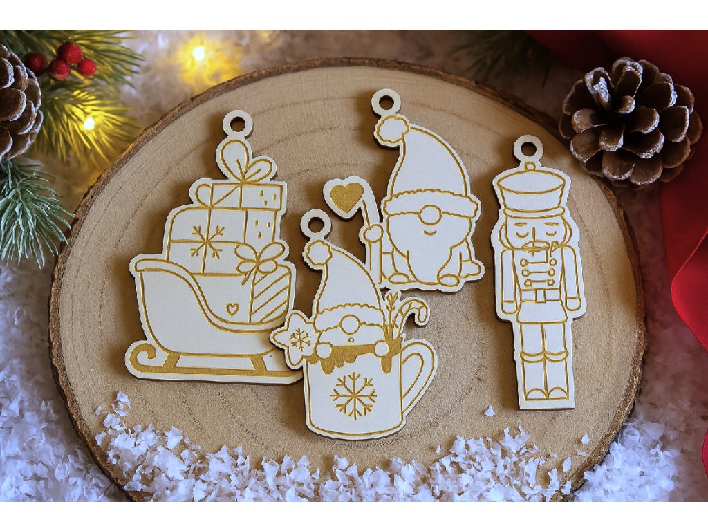 Sadu tvoria štyri autorské ozdoby s jemným laserovým gravírovaním. V kresbe pekne vyniknú kontúry darčekovej sánky, hrnčeka so sviatočnými drobnosťami, sympatického škriatka aj klasického vojačika – luskáčika. Každý kúsok je vyrezaný presne a následne ručne dočistený, aby bol povrch hladký na dotyk a pripravený na zavesenie. Kolekcia pôsobí jednotne, zároveň je každá ozdoba malým príbehom, ktorý vo výzdobe vytvorí príjemné, hravé akcenty.