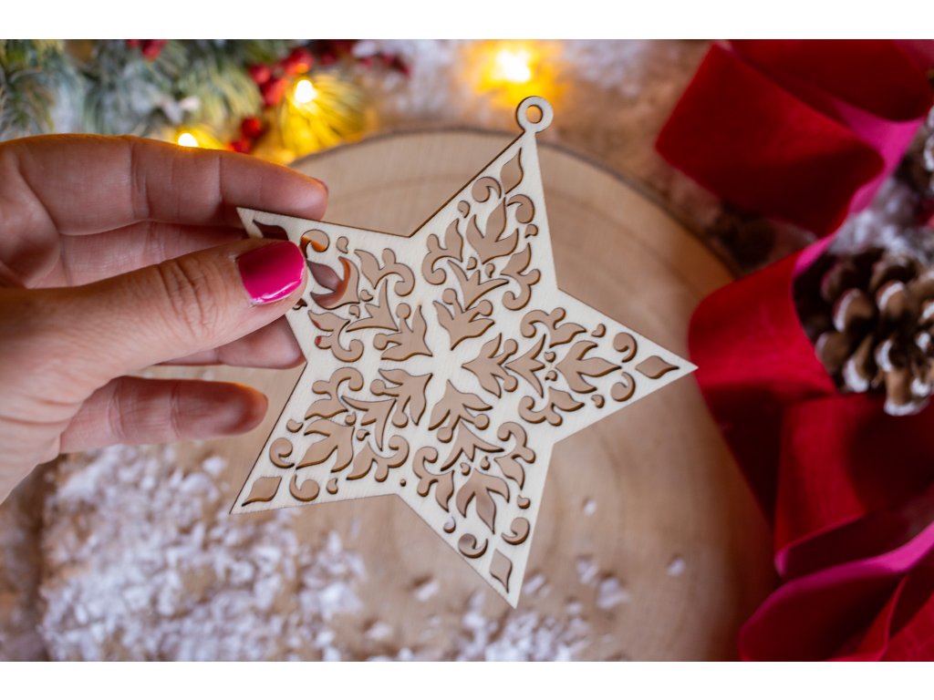 Hviezda je symbol, ktorý Vianociam svedčí najviac. Naše drevené hviezdy majú filigránový výrez s elegantným ornamentom, takže pôsobia vzdušne a pritom výrazne. Každý kus vzniká kombináciou precízneho laserového rezu a ručného dočistenia pre hladký, príjemný povrch. Predávame ich v sade 3 kusov, čistá krása dreva pripravená doplniť váš štýl. Veľkosť jednej hviezdy je 120 × 120 mm, takže pekne vynikne na stromčeku, venci aj v okne.