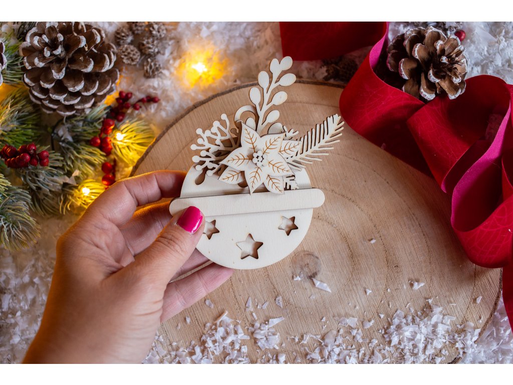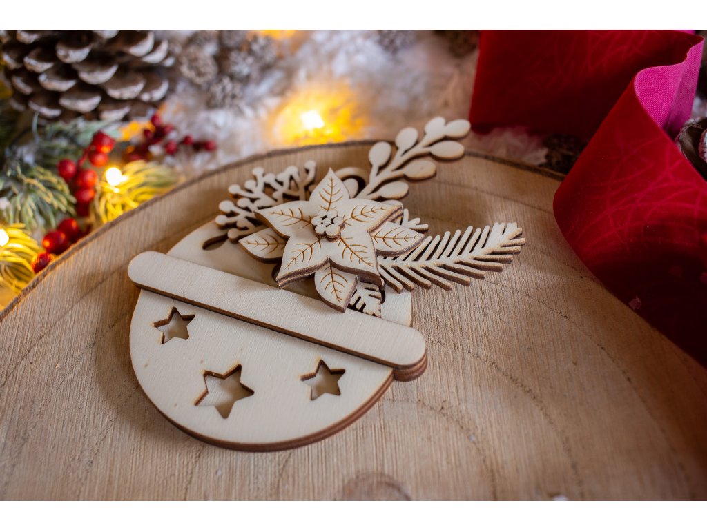 Filigrán & 3D efekt – vrstvené detaily (mašľa/vetvičky/cezmína/vločka/vianočná hviezda/šišky) dodajú ozdobe hĺbku.