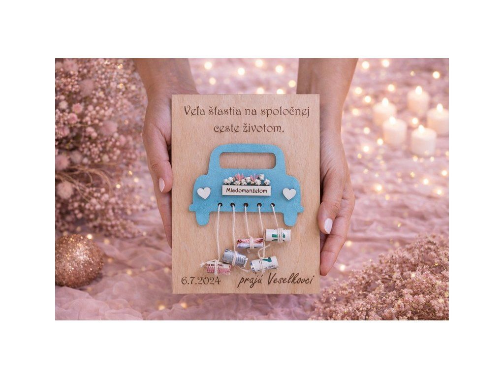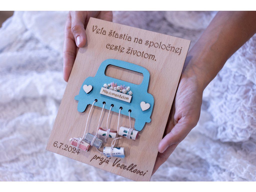 Svadobný deň patrí medzi najkrajšie okamihy v živote dvoch ľudí. Ak chcete novomanželom odovzdať finančný dar originálnym a zároveň elegantným spôsobom, drevené svadobné blahoželanie s motívom svadobného auta je krásnou alternatívou ku klasickej obálke.