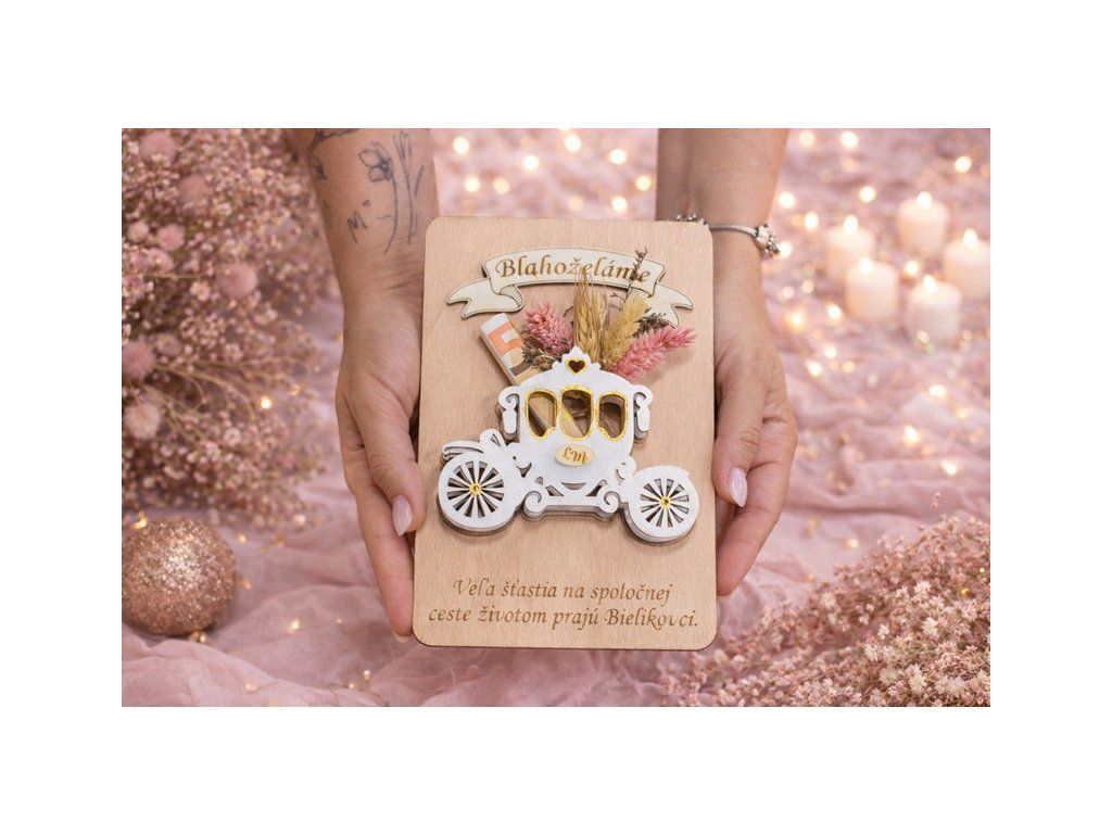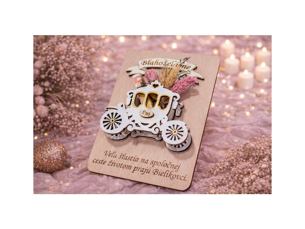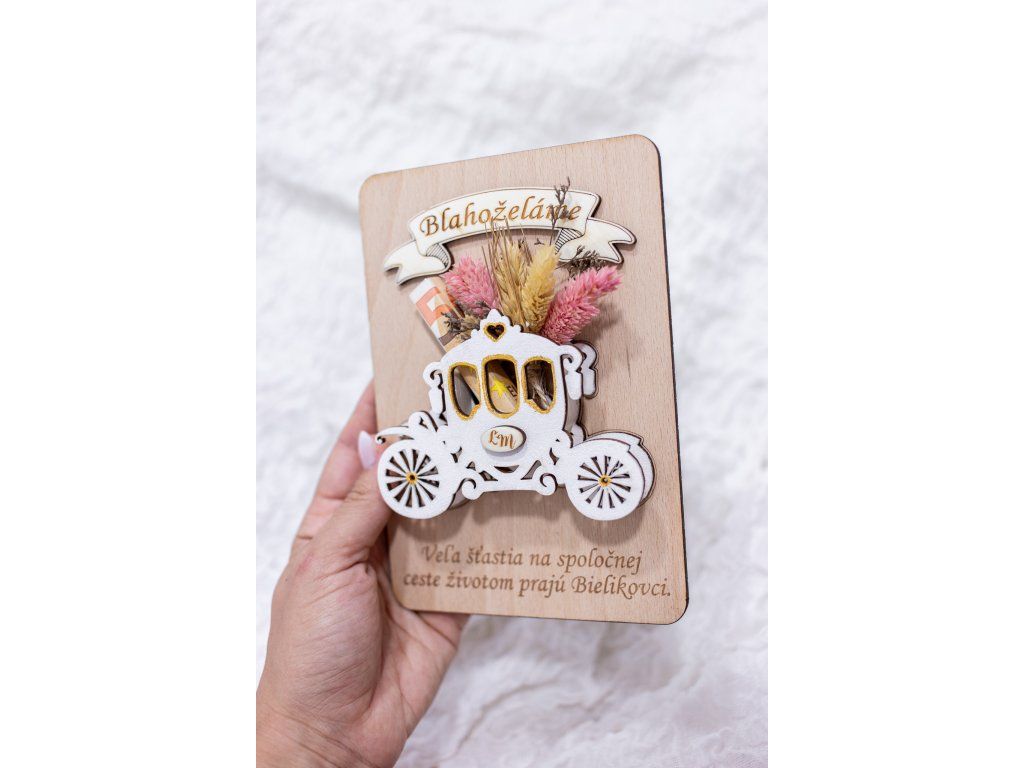 Svadba je výnimočný deň, ktorý symbolizuje nový spoločný začiatok dvoch ľudí. Ak chcete novomanželom odovzdať finančný dar originálnym a elegantným spôsobom, drevené svadobné blahoželanie s motívom koča je krásnou alternatívou ku klasickej obálke.