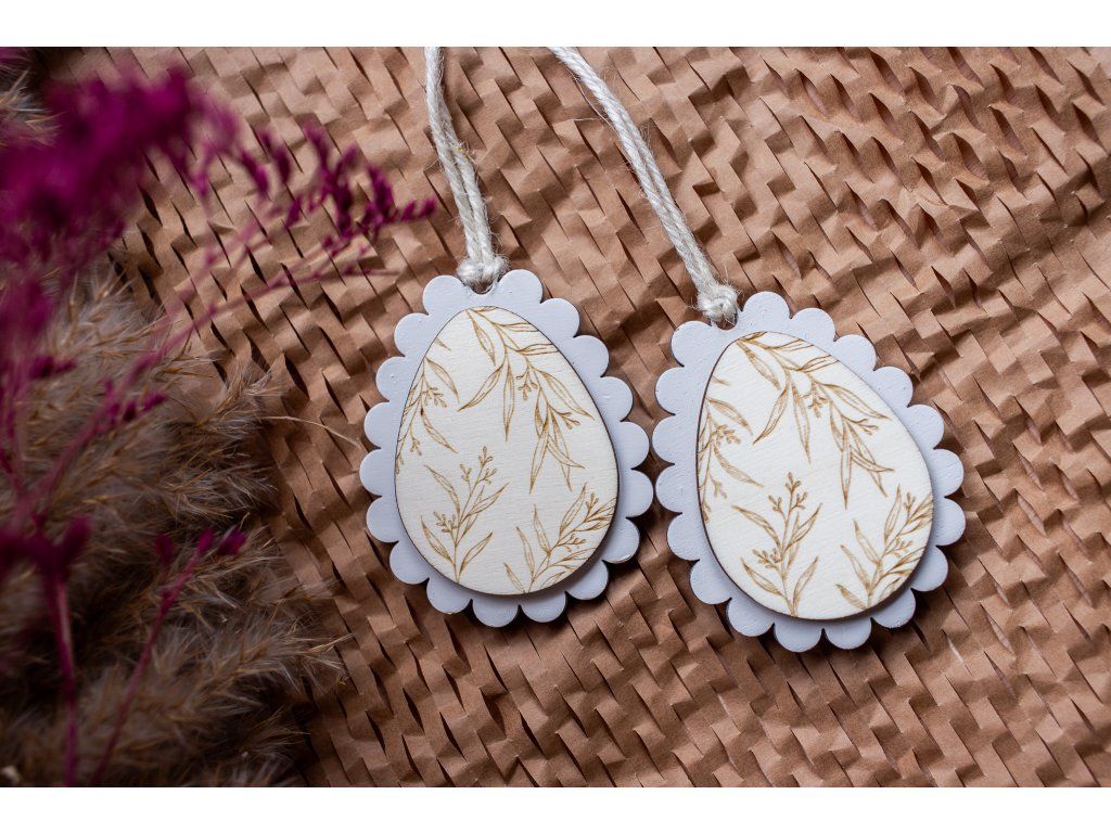 Dekorácia je vyrobená z prírodného dreva a gravírovaná s dôrazom na detail. Motív eukalyptu dodáva vajíčku elegantný a nadčasový vzhľad.