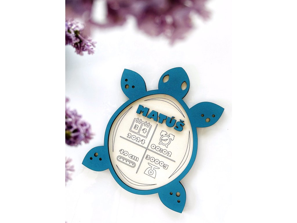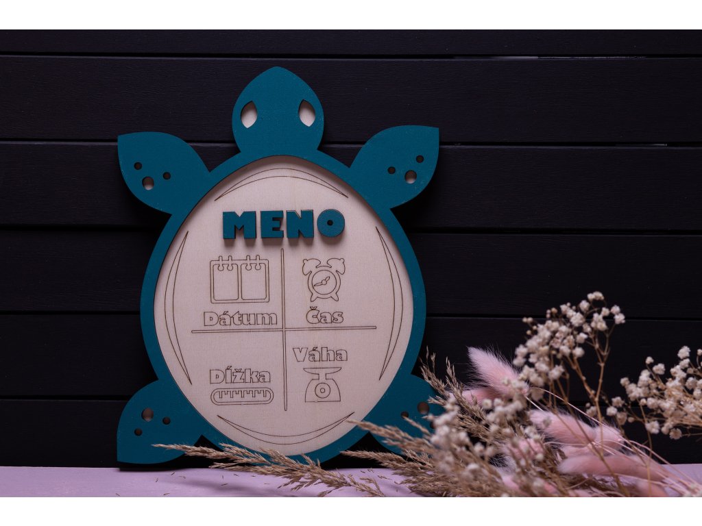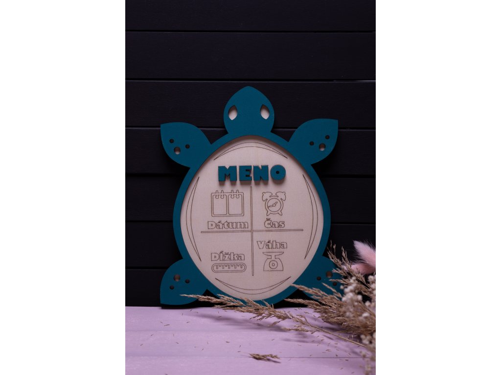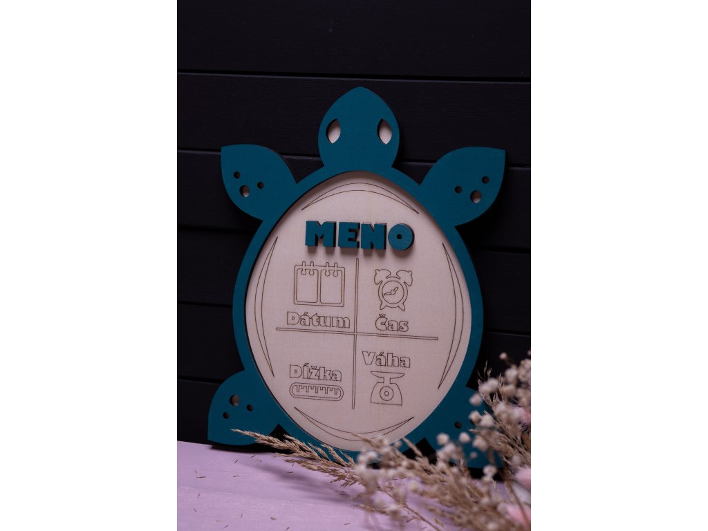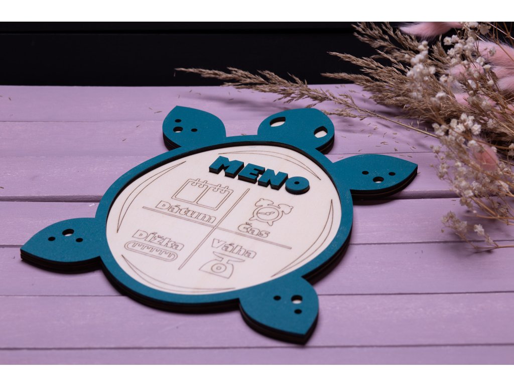 S pamätnou tabuľkou o narodení bábätka, ktorú vám presne na mieru rada vyrobím, budete mať tieto detaily už navždy pekne pospolu. Moja tabuľka vám uchová všetky tie krásne a podstatné maličkosti ako dátum narodenia vášho pokladu, jeho meno, váha a dĺžka . Tabuľku vyrábam zo 4mm topoľovej preglejky vo dvoch vrstvách, vo tvare milej korytnačky. Vybrať si môžete akúkoľvek farbu tabuľky, tak aby sa vám páčila a hodila. Všetky potrebné informácie vrátane farby, prosím uveďte pri objednávke do poznámky.