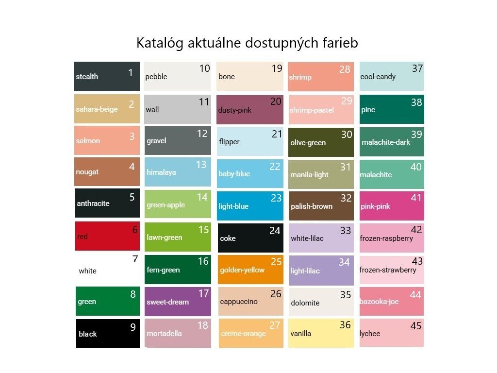 Farba: ružová alebo modrá (bežná svetlejšia, podľa dostupnosti) / vlastná farba (číslo alebo názov farby zo vzorkovníka)