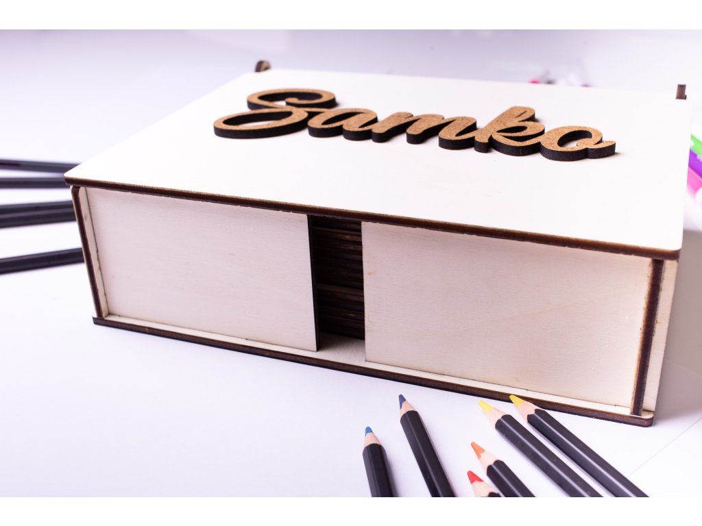 Šablóny vyrábame z topoľovej preglejky a každý kus je jemne brúsený, aby bol bezpečný a príjemný na dotyk. Praktický drevený box pomáha udržať šablóny pekne uložené a môže byť personalizovaný menom dieťaťa.
