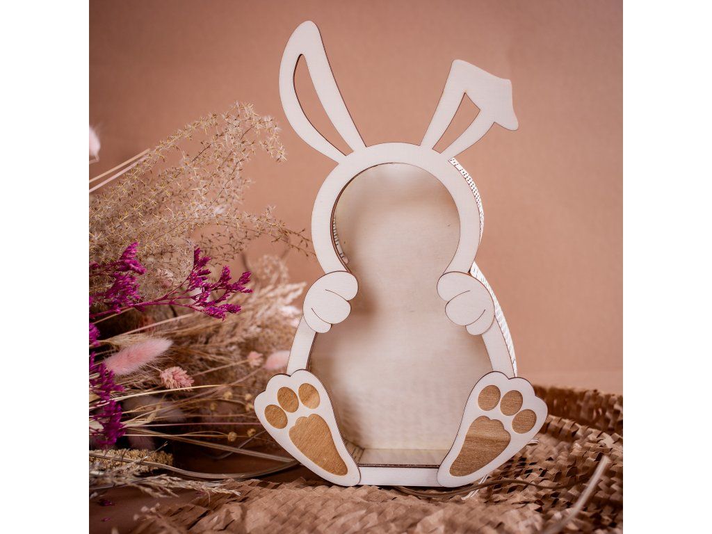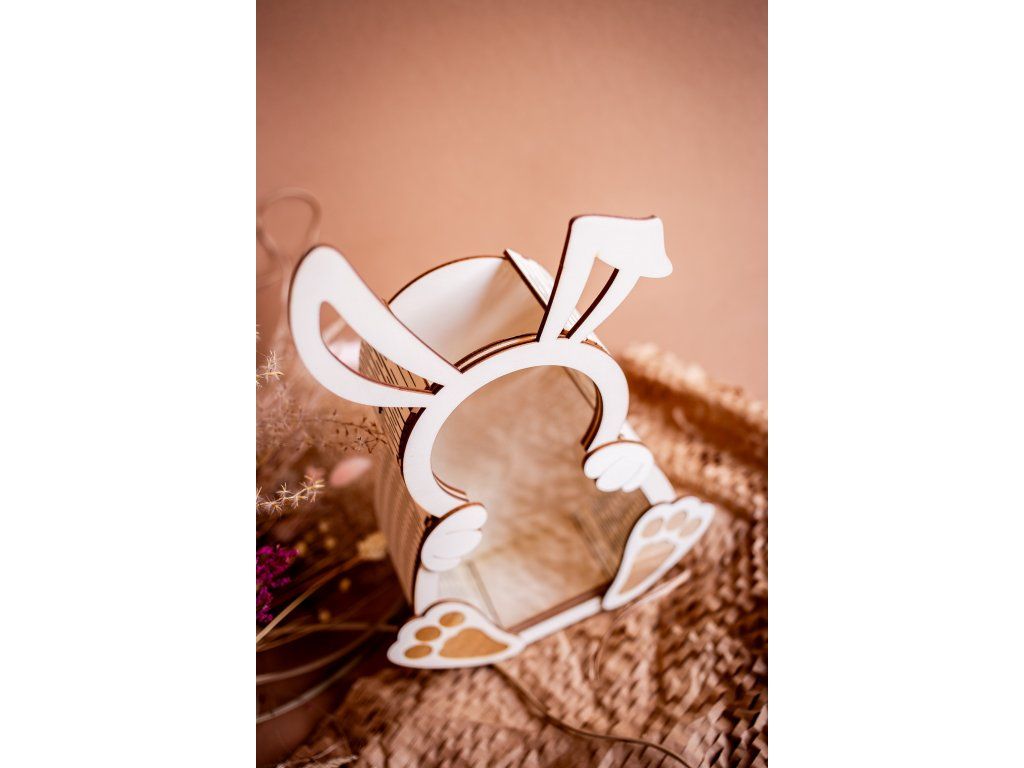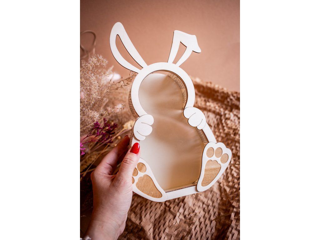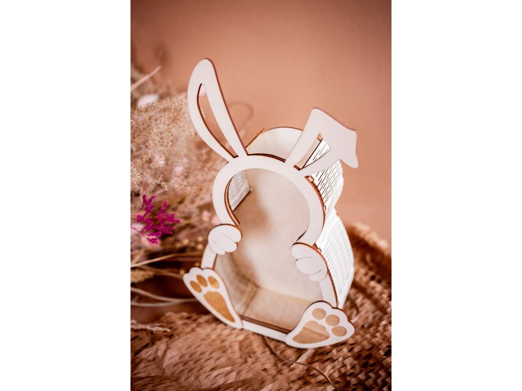 Krabička je vyrobená z topoľovej preglejky a zdobená vyrezávaným motívom veľkonočného zajka. Prírodné drevo dodáva dekorácii teplý a nadčasový vzhľad.