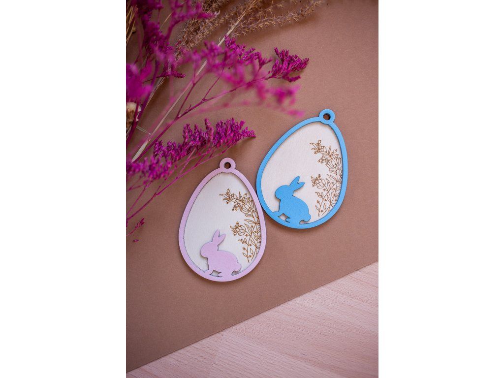 Dekorácia je vyrobená z topoľovej preglejky a zdobená gravírovaným motívom lúčnych kvetov so zajkom. Pastelové farebné prvky dodávajú vajíčku jemný a hravý charakter.