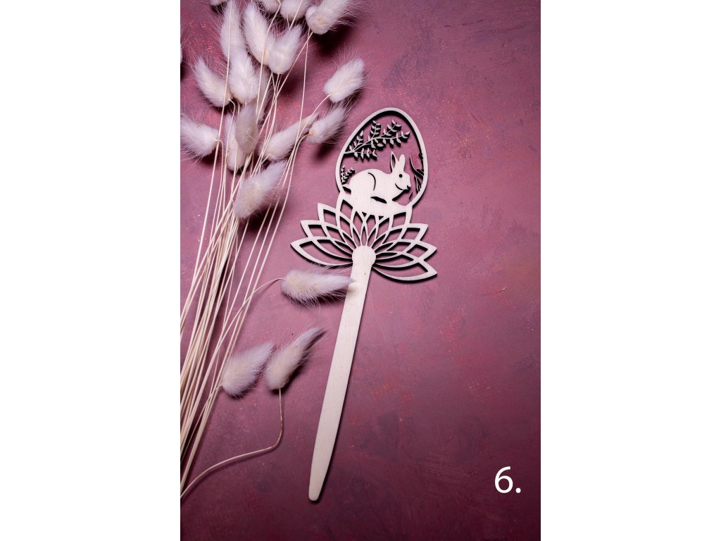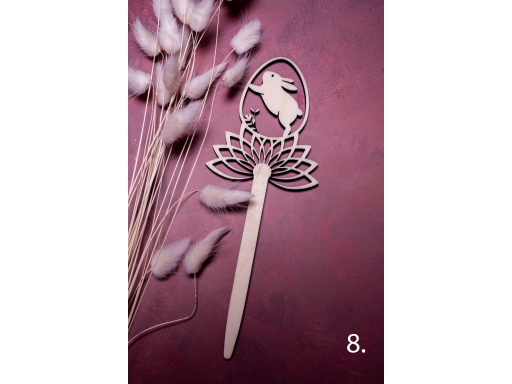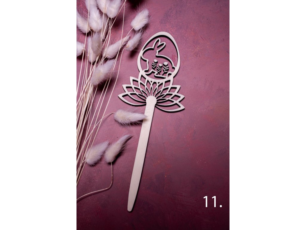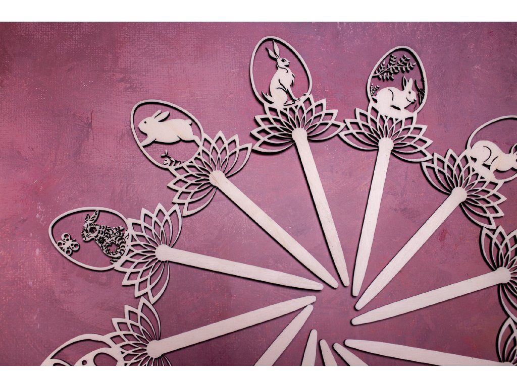 Zápichy do kytičky alebo napríklad do črepníka s krásnym jarným aranžmánom dotvoria veľmi jemným a vkusným spôsobom veľkonočnú atmosféru. Vyrobené sú z jednej vrstvy topoľovej preglejky a celková dĺžka zápichu je 21 cm.